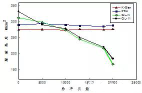 從圖3.2可以看出,對P84針刺氈和窯之星針刺氈兩種濾料樣品,雖然初始的爆破強(qiáng)力比玻纖針刺氈、玻纖覆膜低,但隨著脈沖噴吹次數(shù)的增加,玻纖針刺氈、玻纖覆膜的爆破強(qiáng)力基本上呈線性下降,當(dāng)脈沖噴吹次數(shù)達(dá)到20000次時(shí),強(qiáng)力已下降了45% ,主要原因是玻纖基材不耐折,硬而脆,導(dǎo)致其在長期反復(fù)的脈沖噴吹后,纖維斷裂使濾料整體強(qiáng)力線性下降。而P84針刺氈和窯之星針刺氈由于均為化纖濾料,韌性好,在長期脈沖噴吹過程中,衰減幅度極小,基本成直線狀態(tài),具有良好的耐沖擊性。從而可以斷定,其使用壽命大于玻纖針刺氈和玻纖覆膜。
