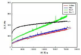 定時(shí)清灰時(shí),各樣品壓差隨時(shí)間變化情況。德國機(jī)械工程師協(xié)會(huì)標(biāo)準(zhǔn)試驗(yàn)中,老化階段是一個(gè)很重要的過程,即模擬“粉餅”形成的過程,采用間隔5s噴吹,共噴吹5000次。在老化過程中,比較各樣品形成“粉餅”的能力及阻力特性。由圖3.4可知,玻纖針刺氈阻力曲線上升趨勢最為明顯,表明該濾料清灰性能較差,粉塵容易滲入濾料深層,導(dǎo)致阻力上升速度較快;玻纖覆膜表面有一層PTFE微孔膜作為人造“粉餅”層,初始阻力比其他三種濾料都要高;而P84針刺氈和窯之星針刺氈兩條阻力曲線則上升平緩,顯示了獨(dú)特的低阻特性。