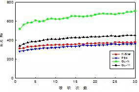 表3-1為四種樣品清潔時(shí)的透氣量數(shù)據(jù),因玻纖硬而脆,纖維基本沒有卷曲,成氈后纖維纏結(jié)少,因此孔隙率相對化纖濾料低,故而GL-N透氣量低;GL-11透氣性主要由表層e-PTFE薄膜決定,PI與K-Star同屬化纖濾料,纖維卷曲度高,纖維之間纏結(jié)度高,因此成氈孔隙率高,透氣性好。